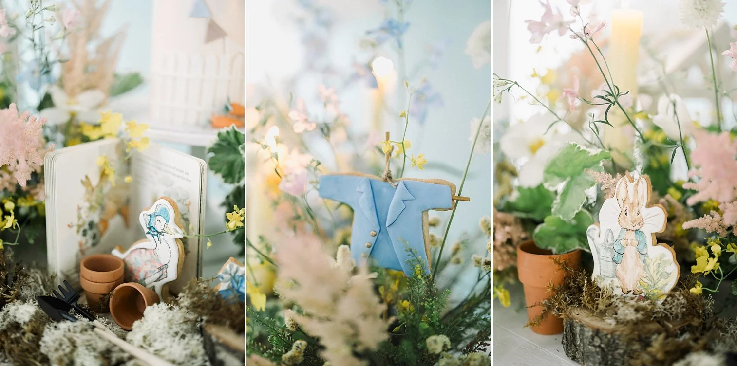 light blue backdrop with dirt? floor with lot’s of garden + nature inspired props and furniture + plants a+ flowers