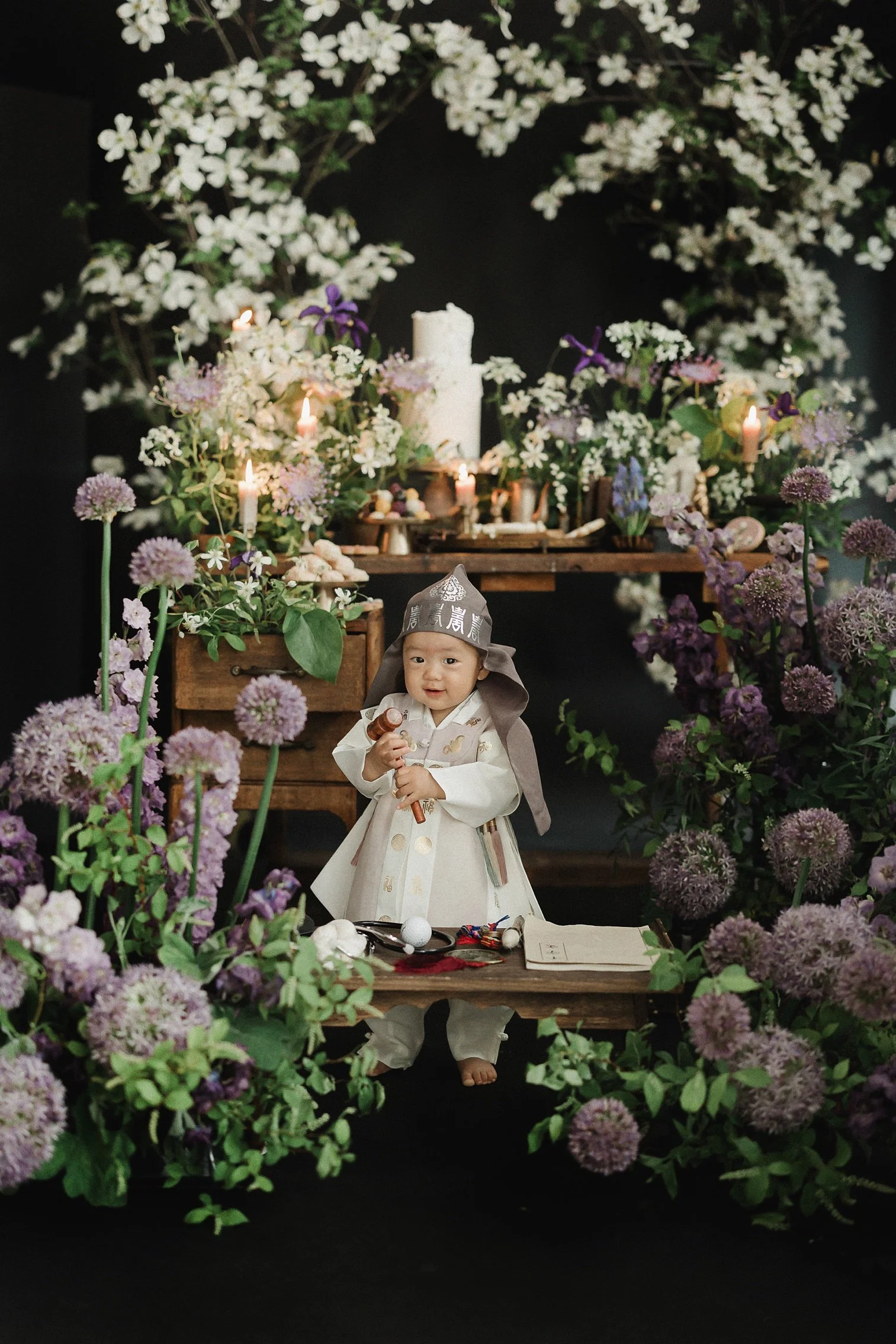 (baby + mom/dad included. $100 extra person) 45-50 minute (back to back ) fresh floral party table session. The dohl table, cake, and tteok/Korean desserts and full floral backdrop is included)
