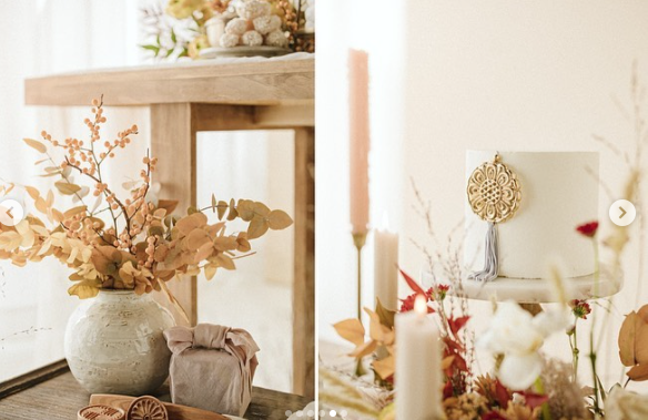 but overall beige+ bright background with bright autumn inpired flowers everywhere. ^^