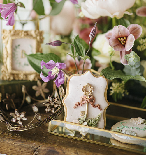 cake with flower or bow + theme (name) cookies or deserts (optional)