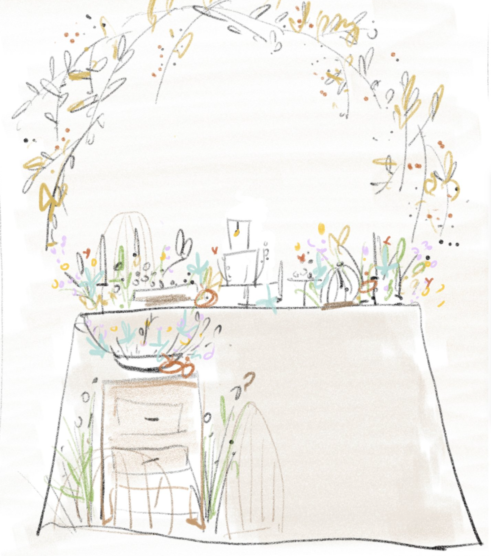 원래 뒤에 뭐 거는건 extra 이지만 저희가 디자인도 너무 늦게 시작 했고 ( 죄송해서 ㅜㅜ ) 저번주 웨딩때 노랑 가지들?? 이 남아서 배경에 너무 무겁지 않게 몇개 걸어 주면 예쁠꺼 같아요. extra charge 없이 걸어 드릴꼐요. 괜찮으세요? ^^