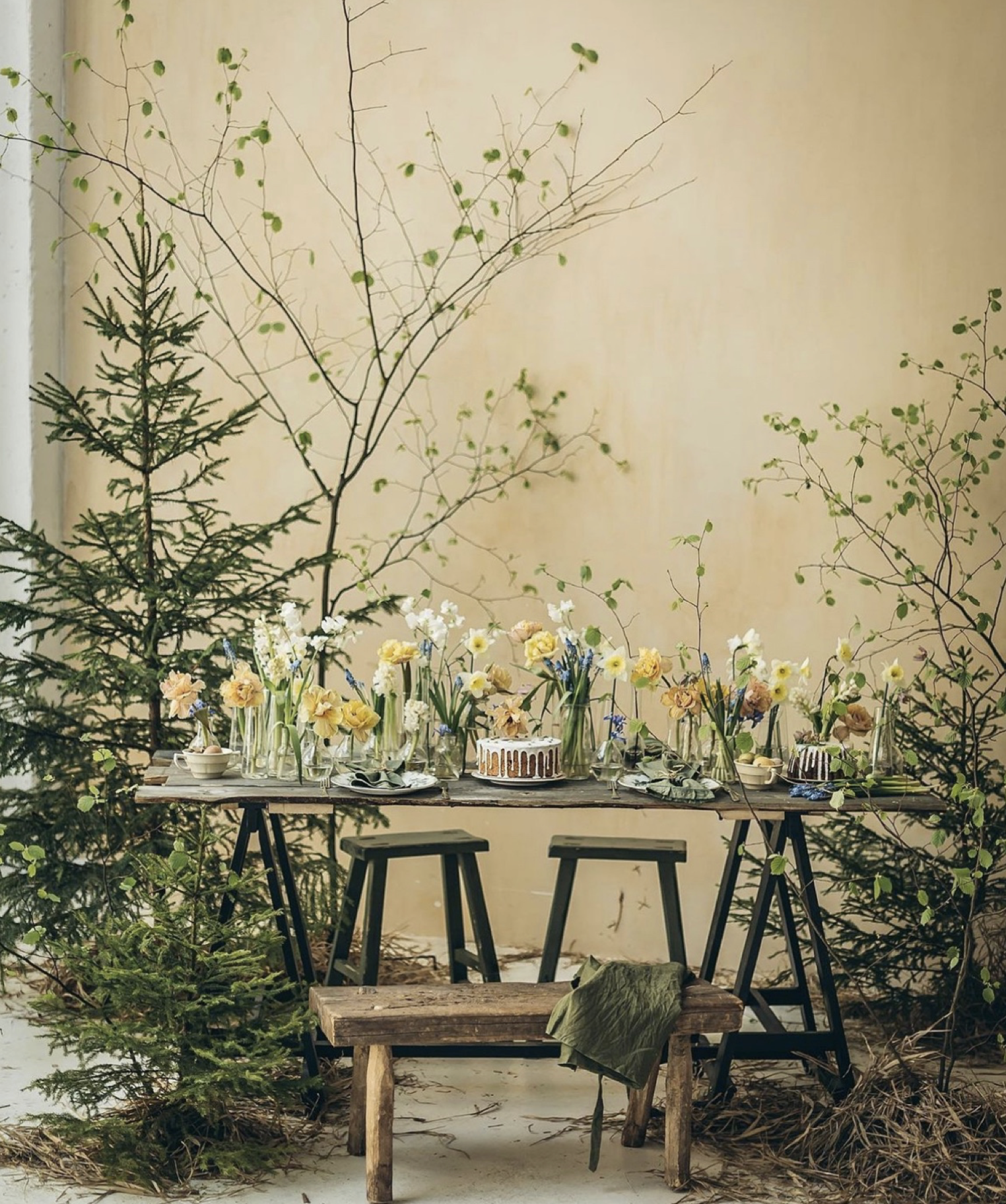 main table : 눈온 겨울 숲? 느낌을 테이블 위에 만들어 보려고 해요. 겨울과 봄의 사이 정도? 케익 + 초 + 눈 + 겨울 가지 + 소나무 + 봄꽃들