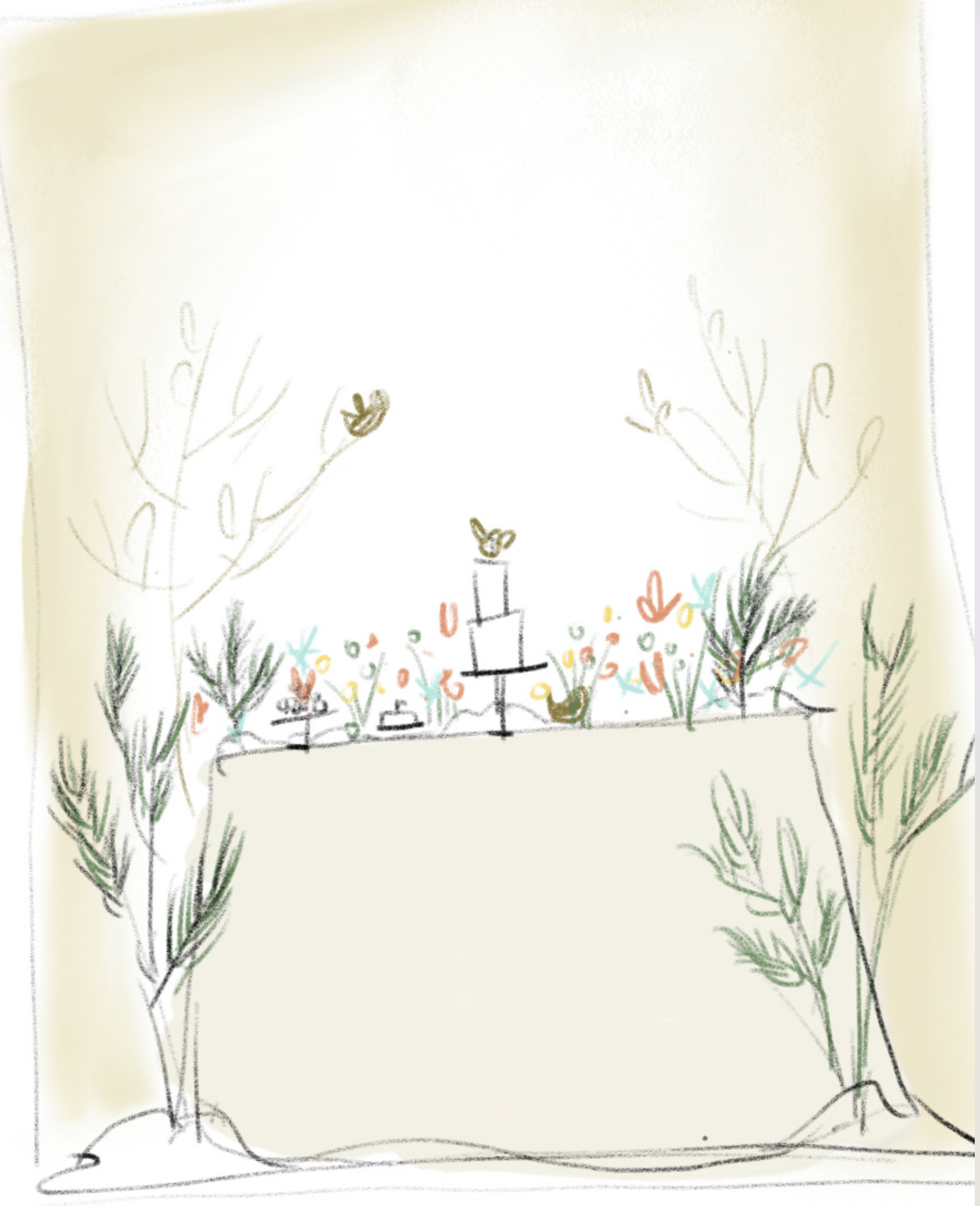 그림이 엉망이라 죄송해요. ^^ 하지만 ㅋㅋ 요론 느낌. 테이블 위에는 작은 숲? 느낌이 되었으면 좋겠고 눈이 ㅋㅋ 약간 왔으면 좋겠고, 원하신 따뜻한 느낌은 파스텔과 다뜻한 색감의 꽃을 사용해 볼께요. 한복과 어룰리게 전통 소품을 함께 조금 사용할께요. 전통이라 떡/한과 등 약간 추가 ($) 해주실수 있으면 좋아용.